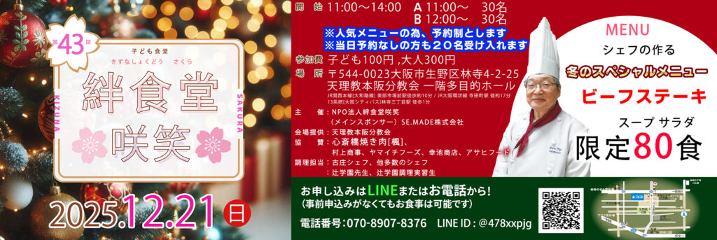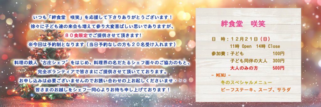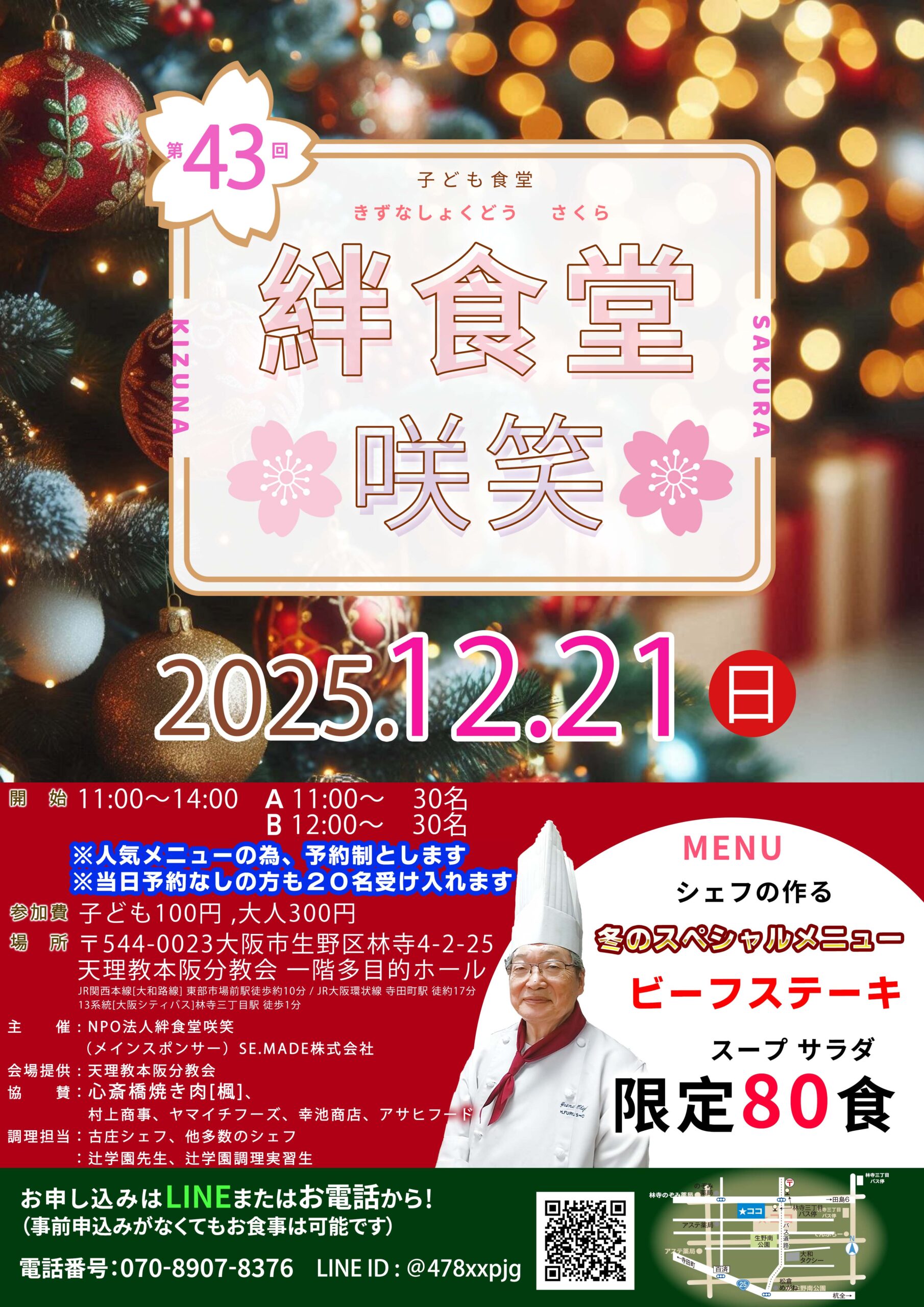 2025年12月21日(日) 絆食堂 咲笑(きずなしょくどう さくら)開催! 2025 12/03 地域の皆様へ 2025年12月3日 2025年12月3日 2025年12月21日(日) 絆食堂 咲笑(きずなしょくどう さくら)開催! 地域の皆様へ よかったらシェアしてね! URLをコピーしました! URLをコピーしました!
